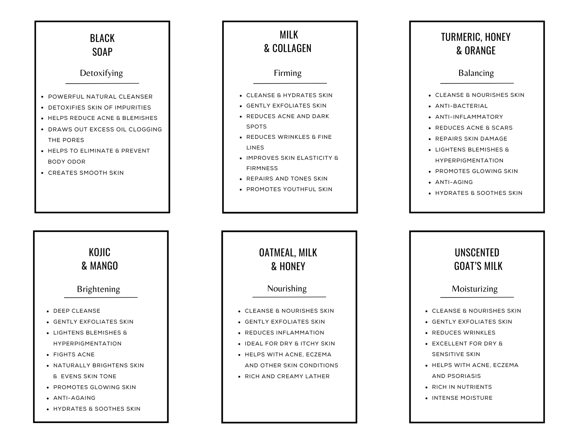 The Signature Soap Collection Set features six (4.5oz each) of our Premium Handmade Soaps. Including: Black Soap, Milk & Collagen, Turmeric + Honey & Orange, Kojic & Mango, Oatmeal + Milk & Honey and Unscented Goat's Milk.